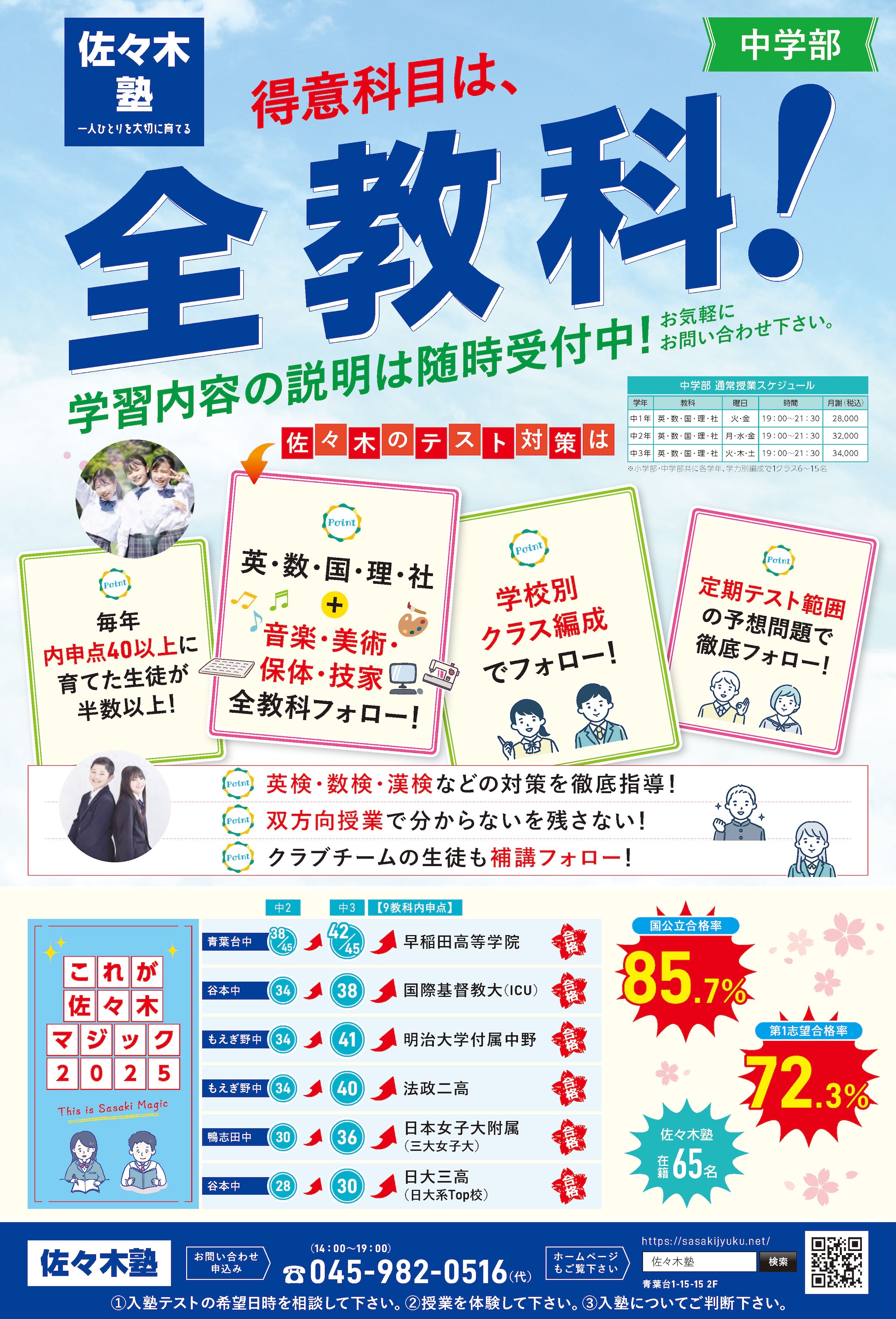 | *佐々木塾では宣伝のための実名表記、顔写真、中学校名の掲載など個人情報の公表は一切しておりません。 | |